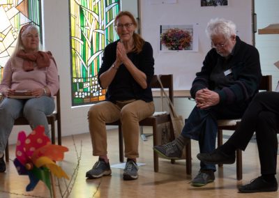 Zum thematischen Abschluss bildeten wir sonntags nach dem Morgenlob (angeregt von einem Gebet von Ruth Helfrich) Gesprächspaare und gaben einander in einem Blitzlicht Teil an den wichtigen Erfahrungen des Wochenendes. Kristina leitete dann einen Wortgottesdienst, der von tiefgründigen Texten, Lesungen, gemeinsamen Gebeten und viel Gesang geprägt war. Und auch einem Moment der Stille, in dem ein Lied eines bekanntes Missbrauchtäters doch nicht gesungen wurde und stattdessen der Betroffenen gedacht wurde. Am Ende des Gottesdienstes baten wir um den Segen für Kristina und Annette, Ralf hatte dazu ein klingendes Segensgebet von Annette Jantzen mitgebracht.