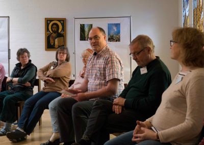 Biblisch näherten wir uns auch dem Thema: Winfried Langenkamp begleitete uns durch einen Bibliolog zu Psalm 8 („Die Herrlichkeit des Schöpfers-die Würde des Menschen“), umrahmt von einer Szene aus dem Laubhüttenfest (Sukkot) und in den Rollen einer jungen Frau, eines alten Tagelöhners, eines Bauern und schließlich der Erde. Überraschend für ihn kamen viele der Antworten aus den unterschiedlichen Perspektiven zu Krisenthemen (soziale Ungerechtigkeit, Folgen des menschengemachten Klimawandels u.a.), auch danach unterhielten wir uns noch weiter: Was macht eigentlich Würde aus? Wer verleiht sie, kann sie entzogen werden? Was ist mit den anderen Geschöpfen Gottes, neben dem Menschen?