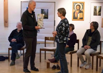 Und schließlich folgte noch ein Abschied: Wegen Aufgaben rund um den Limburger Transformationsprozess hatte die bisherige kirchliche Assistentin, Kristina Wolf, schon bekannt gegeben, dass sie ihr Amt zurückgebe. Sie zog ein Resümee ihrer Tätigkeit und stellte anschaulich dar, was einer missionsärztlichen Schwester, die zwar schon Verbindendes zur ignatianischen Spiritualität hat, doch am internen „GCL-Sprech“ fremd vorkam und wie sie ihre Aufgabe entdeckte, immer wieder von außen dazu Rückmeldungen und Anfragen zu stellen. Der Regionalgemeinschaft schenkte sie zum Abschied eine selbst gestaltete Kerze, natürlich mit dem GCL-Kreuz: in rot für das Lebendige und die Liebe, mit vielen bunten Strahlen für die Vielfältigkeit der Gemeinschaft. Gerne wäre sie noch Assistentin geblieben – und so lud sie Ralf in der Danksagung auch ein, einfach dabei zu bleiben und mindestens zum nächsten Regionaltreffen wieder zu kommen. Passenderweise überreichte er eine Geschenktasche „Wundertüte GCL“…
